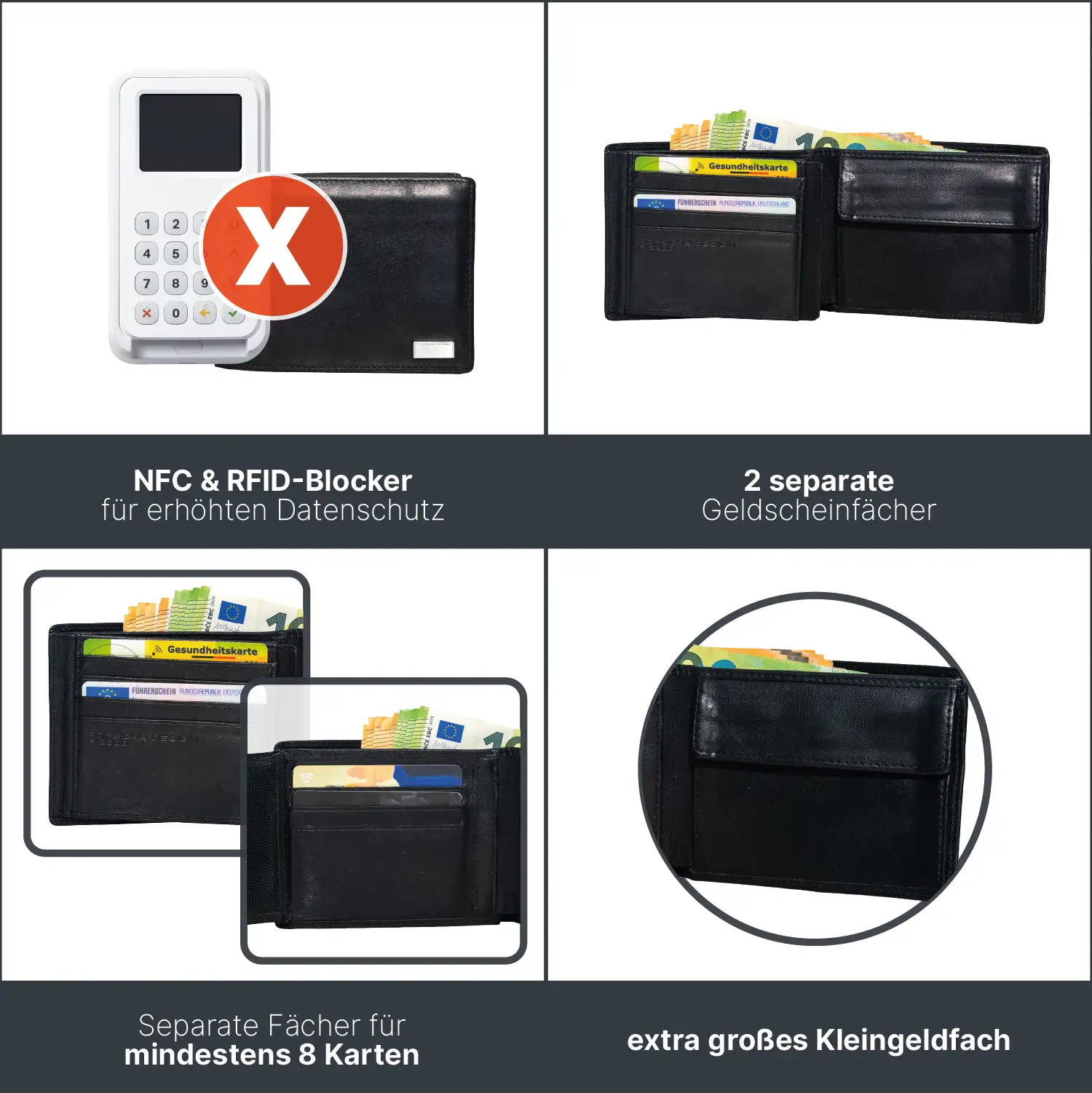 ✔ Platz für mindestens 10 Karten inklusive Sichtfach und zusätzlichem Netzfach für Ausweis oder Führerschein
